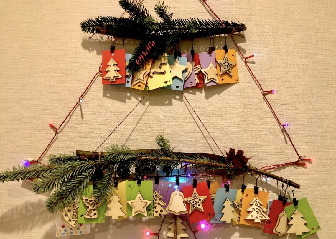 2021年12月1日 /日日是好日 — 溫暖互動的聖誕倒數月曆 今年Sharinna自己手工的做了聖誕倒數月曆,跟大家分享製作的心得。 樹幹是到公園剪了兩根掉落草皮上的殘枝幹,再到花店買了兩根聖誕樹的支幹來搭配,將百元店的彩色紙剪成一樣大小,搭…