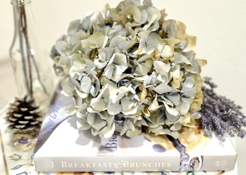 4)紫陽花(繡球花): 建議買大顆的,品種是葉子比較硬一點的,藍紫色曬乾後,過1年 會開始慢慢變黃(秋天落葉感)很古董的風味!