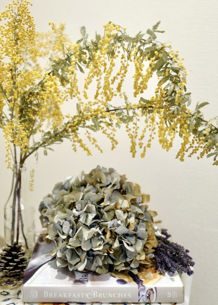 5)金合歡:開滿黃色的小花,垂墜式的樹根,曬乾後放在藍紫色繡球花旁邊,有一種歐洲小店的感覺。